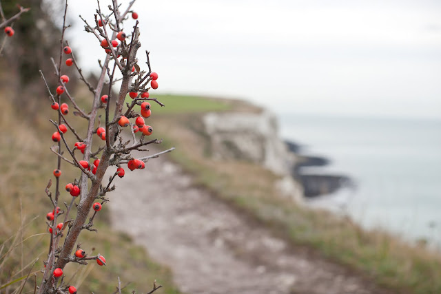 We walked beyond the café's carpark, where a panaromic view of the chalky white cliff met us, still resplendent  in the low sun. I was shivering from fear of heights though I know any kind of mistake will just land me at the Saxon walk, a grassy walkway 10 m down, instead of the sea. The chalk on the floor has yet to dry from the previous day's rain and our shoes became muddy and sticky from the clay and chalk.